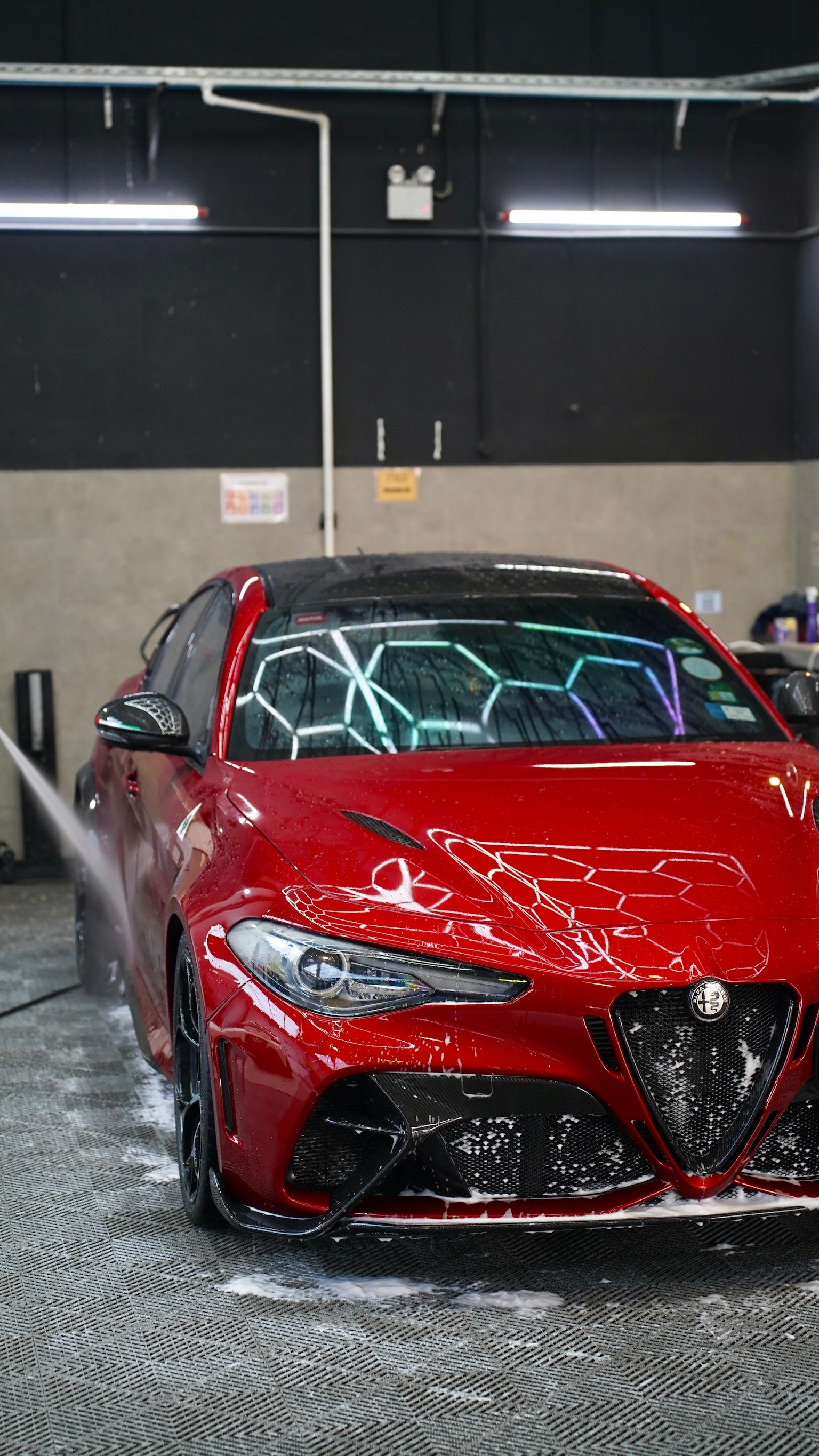 Specialist maintenance wash for this Alfa Romeo Giulia GTAM's full Paint Protection Film (PPF). Our process safely cleans and enhances the PPF while preserving the car's aggressive, show-ready condition.